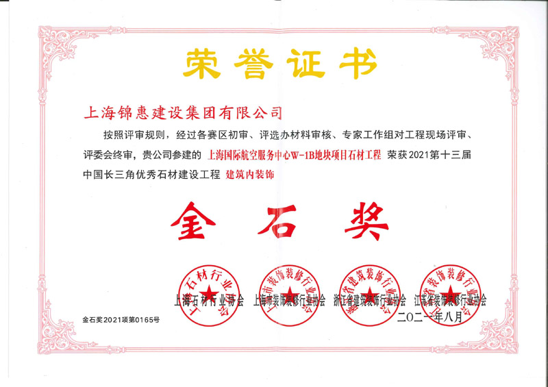 近日,在江、浙、滬三地建設管理部門(mén)的支持指導下,上海石材行業(yè)協(xié)會(huì )、上海市裝飾裝修行業(yè)協(xié)會(huì )、浙江省建筑裝飾行業(yè)協(xié)會(huì )、江蘇省裝飾裝修行業(yè)協(xié)會(huì )聯(lián)合相關(guān)管理部門(mén)和建設大口單位,共同舉辦2021第十三屆中國長(cháng)三角優(yōu)秀石材建設工程金石獎評選活動(dòng)。上海錦惠建設集團有限公司參建的上海國際航空服務(wù)中心W-1B地塊項目石材工程,榮獲2021第十三屆中國長(cháng)三角優(yōu)秀石材建設工程“金石獎”殊榮。